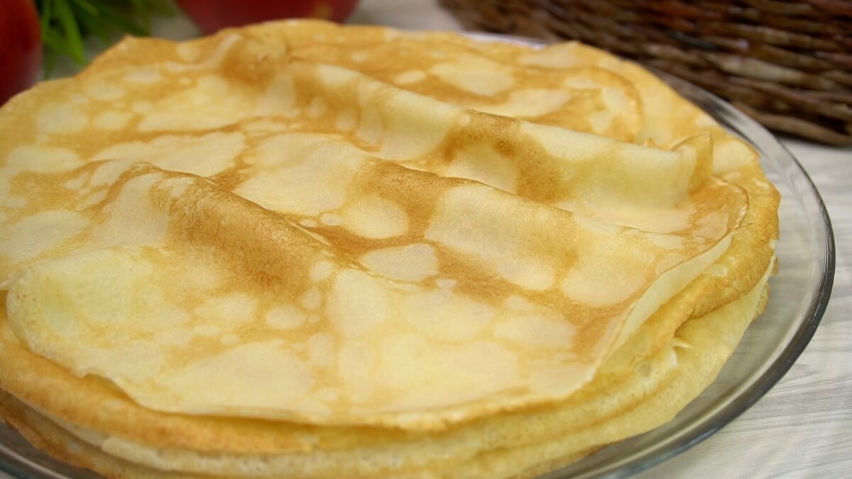 Из указанного количества ингредиентов можно получить около 14 блинчиков диаметром 22 см. Подавайте их с растопленным сливочным маслом, сгущенным молоком или по личным предпочтениям.