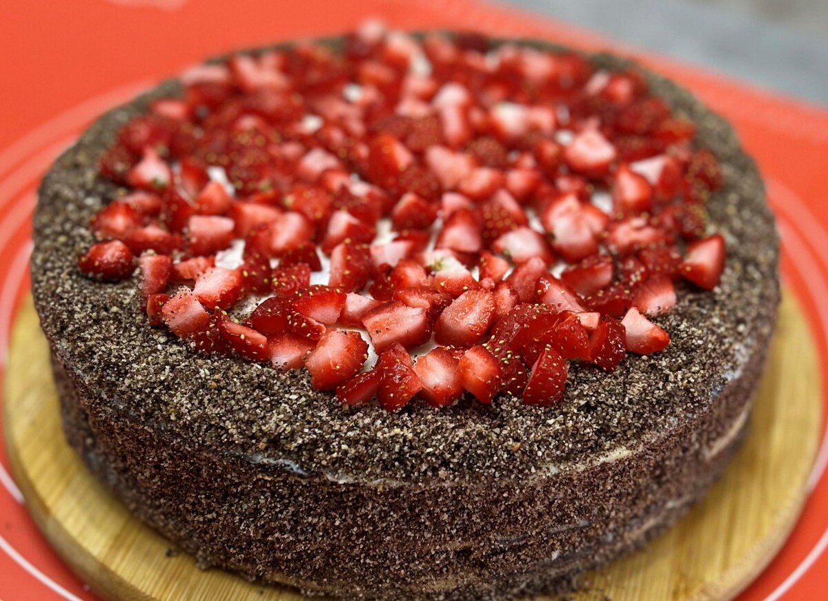 Соберите торт, смазывая каждый корж подготовленным кремом. Для украшения используйте ягодную крошку и нарезанную клубнику. Дайте торту немного пропитаться, а затем подавайте к чаю, наслаждаясь вкусом и атмосферой детства, пишет Дзен-канал "Домашняя Кулинария".