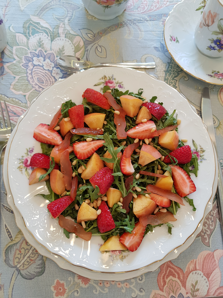 Для начала рукколу следует тщательно промыть и обсушить, а затем равномерно распределить по тарелкам. Персик нарезается кубиками и добавляется к рукколе, а клубнику достаточно разрезать на четвертинки и выложить рядом.