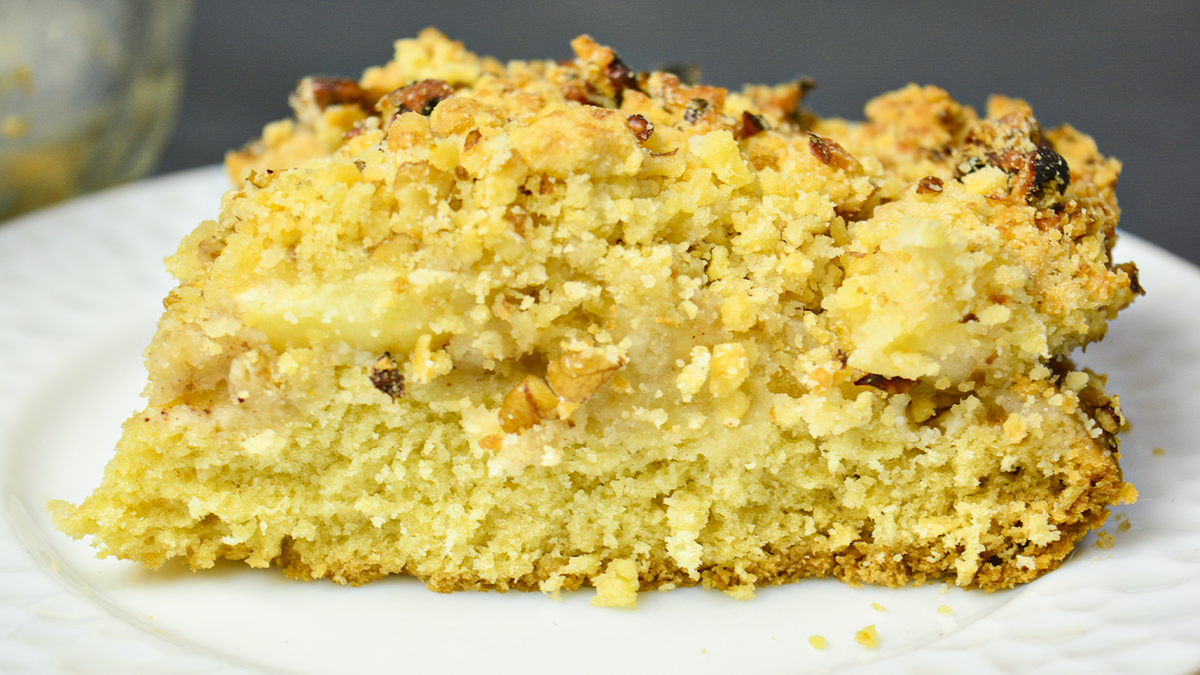Для хрустящей верхушки: в отдельной миске соедините муку, сахар и щепотку соли. Вмешайте сливочное масло, а затем добавьте измельченные грецкие орехи, тщательно перемешивая до получения крошки. Выложите эту массу сверху на яблочную начинку.