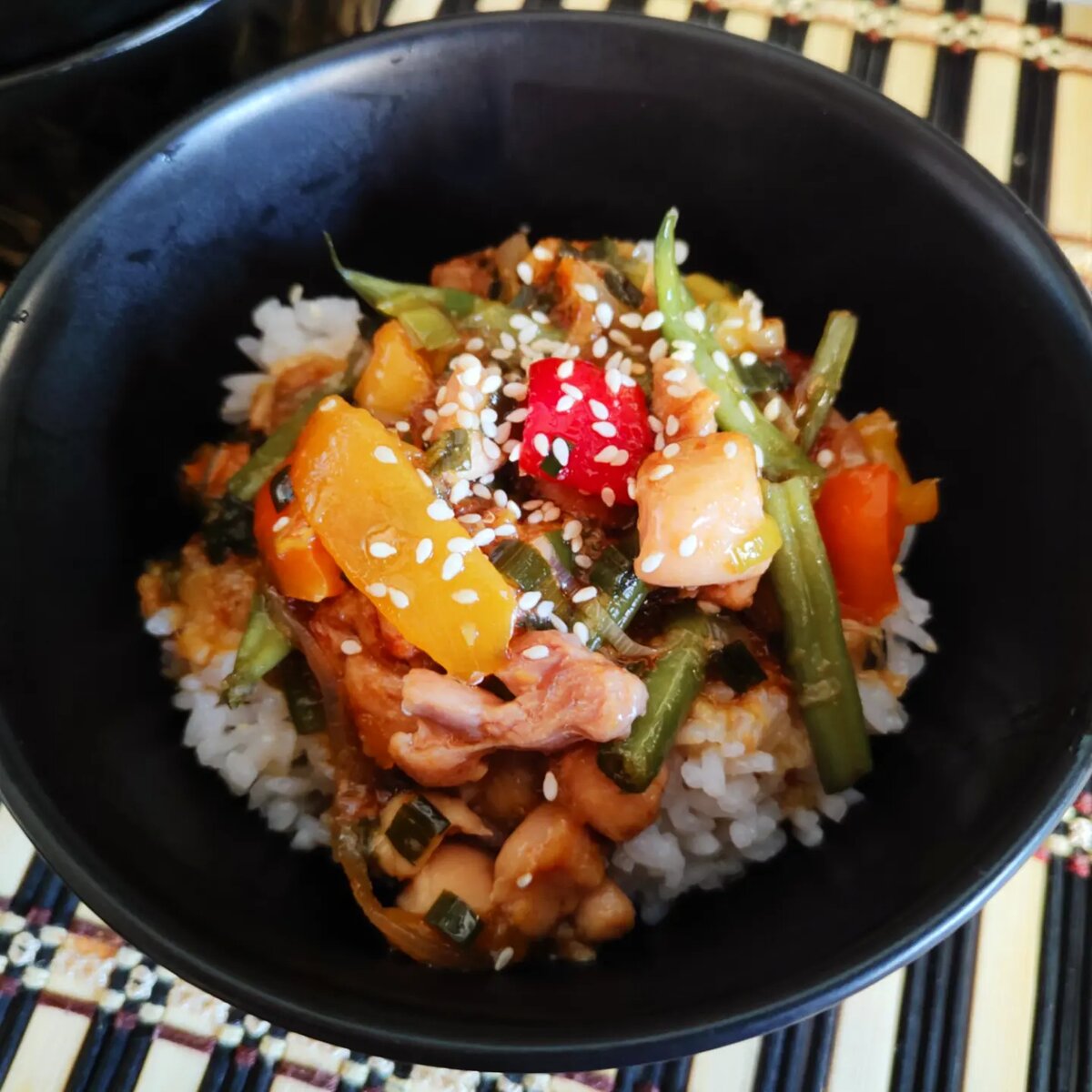 Готовый рис переложить в глубокую миску, сверху выложить курицу с овощами и полить оставшимся соусом. Украсить кунжутом и подавать немедленно.