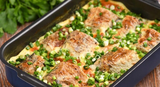 Как только рыба и яичная заливка зарумянится, достать форму из духовки. Блюдо будет источать невероятный аромат!