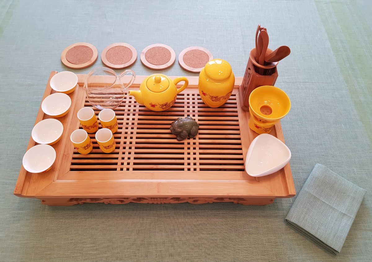 - Чайное полотенце (тякин): это необходимый атрибут, который держится в чистоте. Его сворачивают так, чтобы не было видно краев, а материал должен идеально впитывать влагу.
