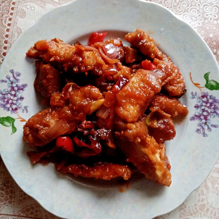 Куриное филе нарезается полосками и обваливается в заранее подготовленной смеси из яблочного уксуса, соевого соуса и кокосовой муки (или семян чиа). Мариновать следует около 20 минут, после чего курицу обжаривают и убирают со сковороды.