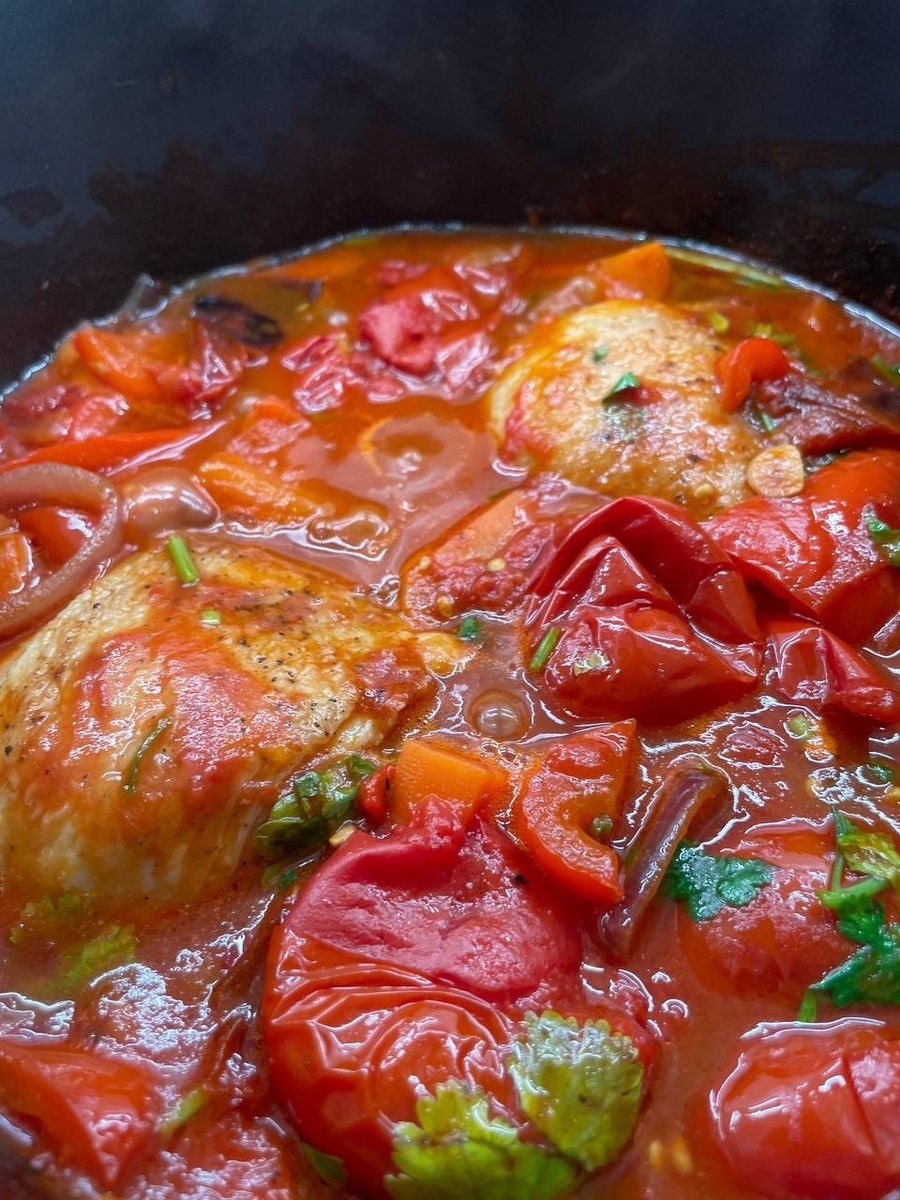 Тушите под крышкой около 30 минут, пока курица не будет готова. За 5 минут до окончания можно добавить рубленую петрушку или кинзу для свежести.