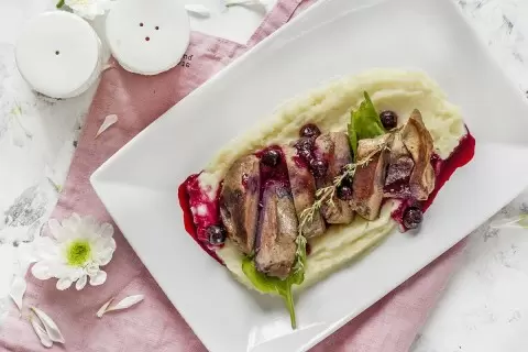 Теперь осталось нарезать утиные грудки на тонкие ломтики и сервировать на тарелке. Выложить пюре, сверху аккуратно разместить шалот и порезанные кусочки грудки. Полить приготовленным соусом по вкусу и добавить для украшения веточку тимьяна. Блюдо готово: оно не только удивительно вкусное, но и невероятно эстетически приятное. Приятного аппетита!