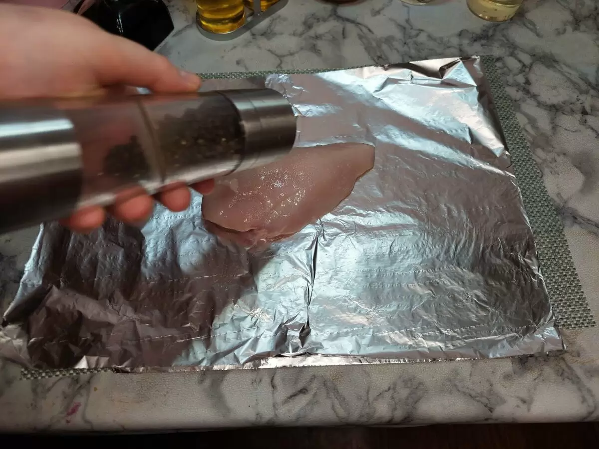 Для начала берется одно куриное филе, которое солится и обсыпается любимыми специями. Далее, его поливают растительным маслом и хорошенько массируют, затем заворачивают в двойную фольгу. Филе отправляется в духовку, разогретую до 180 °C, на 25 минут.