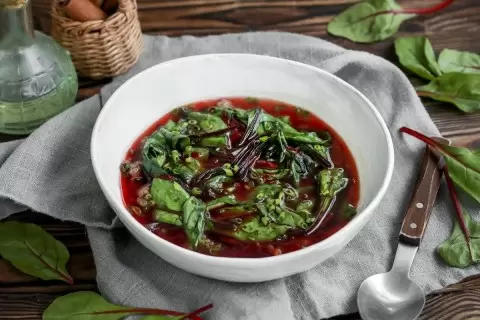 Шаг 3: Свеклу очистить и нарезать тонкими полосками. На сковороде снова разогрейте одну ложку масла и обжаривайте свеклу 3-4 минуты. Влейте 100 мл воды и тушите еще 3 минуты. Переложите в бульон и варите еще 5-6 минут после закипания. В последнюю очередь добавьте листья мангольда, отключите огонь, накройте крышкой и дайте настояться 3-4 минуты.