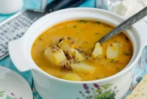 Когда картофель будет почти готов, переместите подготовленное фаршевое мясо с овощами в кастрюлю. Натрите плавленый сыр и добавьте его в суп.
