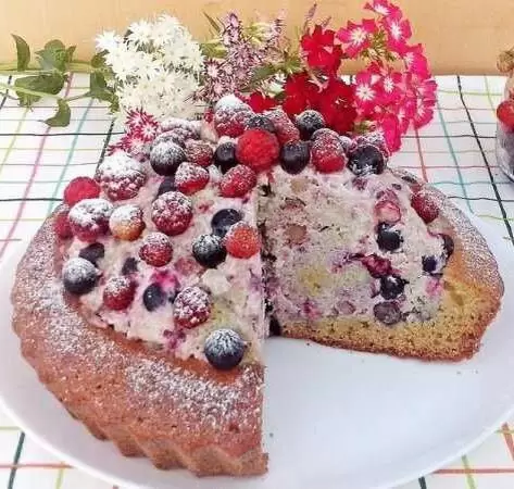 Для крема смешать сметану с сахарной пудрой и ванилином, затем добавить кусочки пирога и ягоды, оставив некоторые для украшения. Аккуратно перемешать и вернуть массу обратно в манник. Украсить сверху ягодами и посыпать сахарной пудрой.