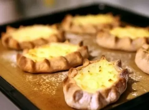 Тесто делится на кусочки величиной с грецкий орех. Каждый кусочек раскатывается до толщины 2 мм, формируя круглые лепешки. В центр каждой раскатанной закладки выкладывается начинка, а края теста защипываются в оборку, оставляя середину открытой.
