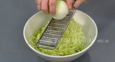 В первую очередь, кабачки натираются на крупной терке. Молодые кабачки не требуют очищения — их нежная кожица лишь добавит вкуса. Лук натирается на мелкой терке и добавляется к кабачкам.