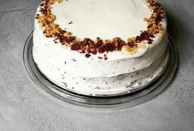 Для создания украшения необходимо отделить белки от желтков и взбить их с сахарной пудрой. В полученную массу добавляют немного лимонного сока для свежести. Ножом аккуратно подравнивают края торта для эстетики, а затем обмазывают глазурью верх и бока десерта. Оставшийся крем можно использовать для финального слоя. Добавить крутую посыпку из печенья на верх готового торта — отличный способ придать ему оригинальность.