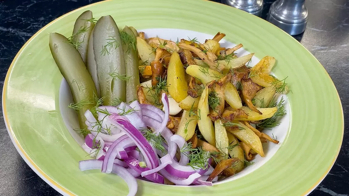Готовое блюдо выкладывают на тарелку, посыпают свежим укропом и подают с луком и солеными огурцами — они придают освежающий контраст к насыщенному вкус у картошки с грибами и создают идеальный симбиоз текстур и ароматов.