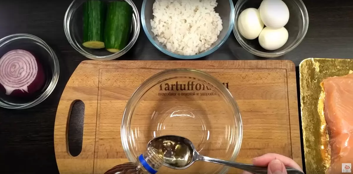В просторной миске объединяют нарезанные кубиками четыре крупных яйца и свежие огурцы. Затем добавляют 200 граммов отварного риса, который делает блюдо более сытным. Все ингредиенты готовы, и пора приступать к заправке.