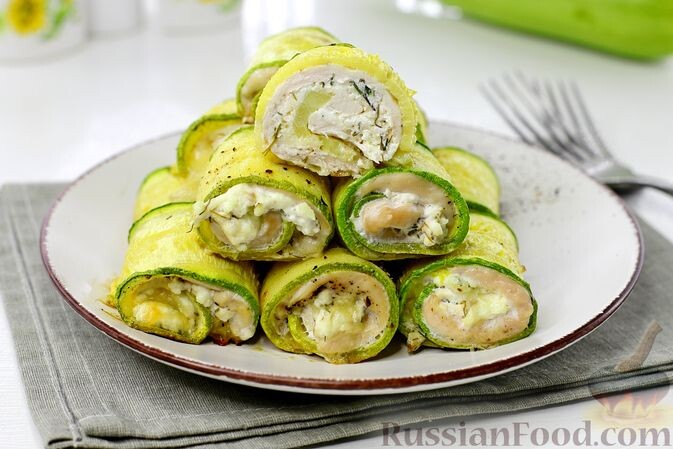 - Рулетики из кабачков с курицей — уникальное сочетание нежного куриного филе и творожной начинки с укропом, завёрнутое в тонкие слайсы запечённых кабачков. Это блюдо не только удивит ваших гостей, но и станет ярким акцентом на столе.