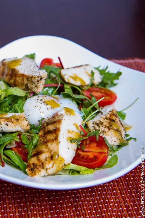 В нашем рецепте тёплого салата с курицей главную роль играет картошка, только что обжаренная до золотистого цвета, нежные ломтики куриного филе и яйцо-пашот, которое аккуратно объединяет все компоненты в единое целое за счёт своей кремовой текстуры.