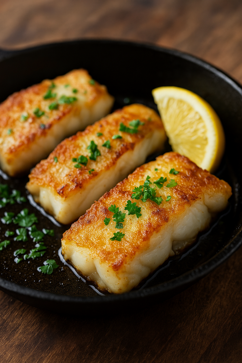 - Приготовление: нарежьте филе, приправьте, обваляйте в муке и жарьте с обеих сторон 3-4 минуты до золотистого цвета. Накройте крышкой на пару минут для сохранения сочности.