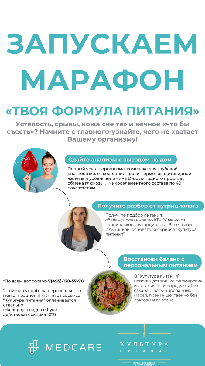 Записаться на акцию и узнать больше о своих дефицитах можно, обратившись в чат или по телефону: 8(495)-120-57-70. Поддержите свое здоровье и получите много новых возможностей с «Культура питания»!
