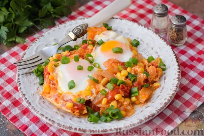 Шакшука с кукурузой добавит ярких красок вашему завтраку. Яйца запекаются в томатной смеси с кукурузой, что создает сочное и аппетитное блюдо.