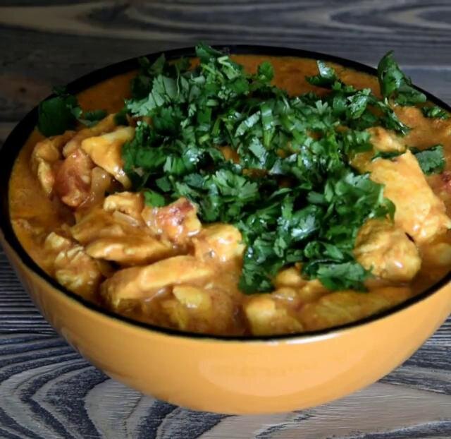 3. Тушение: добавить куриное филе вместе с маринадом и готовить на среднем огне, помешивая, в течение 25-30 минут. За 10 минут до окончания приготовления накрыть крышкой.