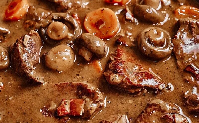 На той же сковороде обжаривают нарезанный лук, добавляя морковь и чеснок. После 7 минут обжаривания смесь укладывают к мясу в кастрюлю. На другой сковороде растапливают сливочное масло и добавляют шампиньоны, обжаривая их до золотистого цвета. В процессе вмешивают просеянную муку, чтобы избежать комочков, и готовят еще 3 минуты.