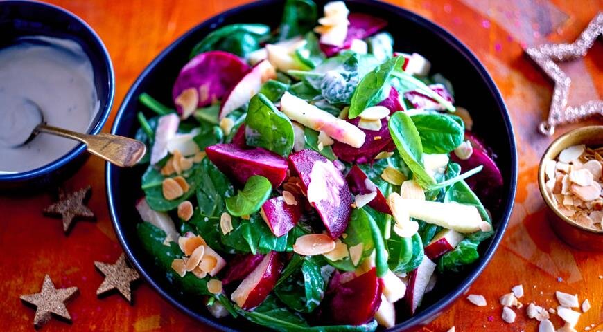Свекла — это не только основной компонент классических салатов, таких как селедка под шубой или винегрет, но и универсальный ингредиент для создания неожиданных сочетаний. Сегодня в центре внимания свежий салат из свеклы с добавлением сладких яблок и обжаренного миндаля. А острота заправки, приготовленной на основе йогурта, майонеза и бальзамического уксуса с чесноком, придаст этому блюду особый шарм и яркость.