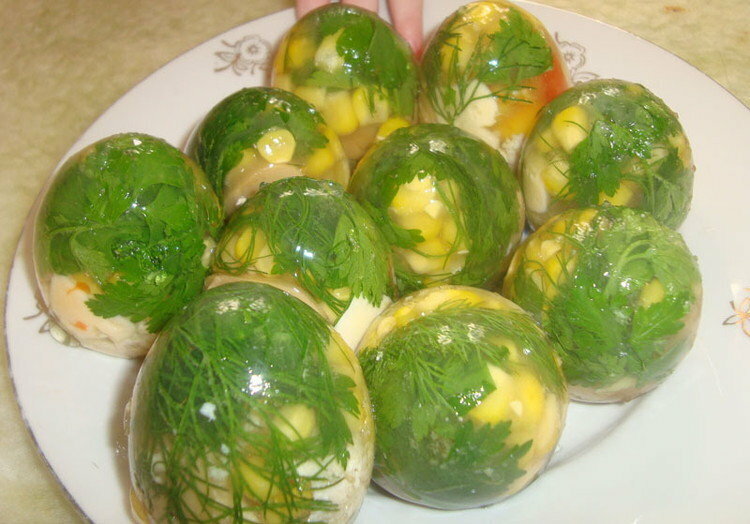 Возьмите 5-6 яиц, сделайте аккуратное отверстие на «носике» и выемьте желток с белком в отдельную миску, увеличив отверстие для удобства. Наполните пустые яйца приготовленной смесью из овощей, яиц, огурцов и зелени, залейте горячим бульоном с желатином и закройте отверстие. Легко потрясите, чтобы все перемешалось, а затем оставьте застывать.