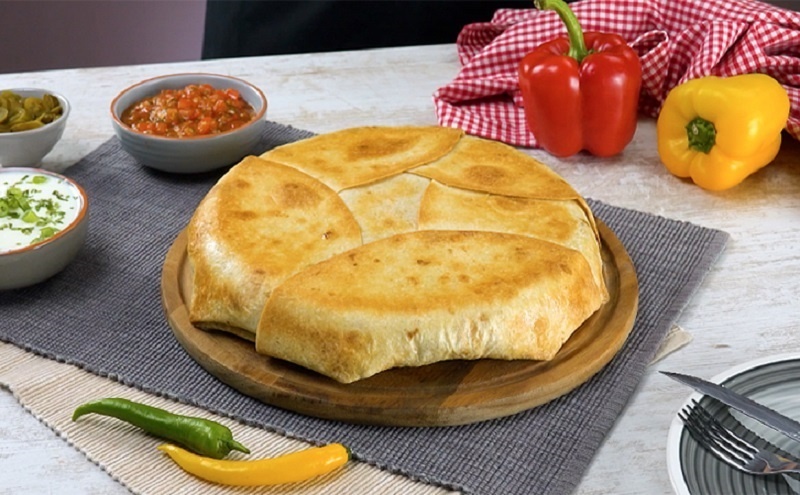 Поместите начинку в жаропрочную форму и выпекайте в течение 15 минут для начала. Далее подготовьте сковороду, смазанную оливковым маслом, и аккуратно уложите 6 лавашей так, чтобы края свисали. В середину положите сыр, сверху — начинку из курицы и овощей, украсьте зеленью и помидорами. Накройте седьмым лавашем и заверните края.