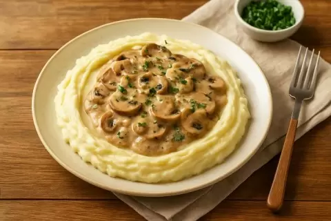 Грибной аромат, заполнивший дом, способен собрать всю семью на одной кухне. Нежная, сливочная подлива придаёт привычной картошке незабываемый вкус, превращая обед в настоящий праздник.