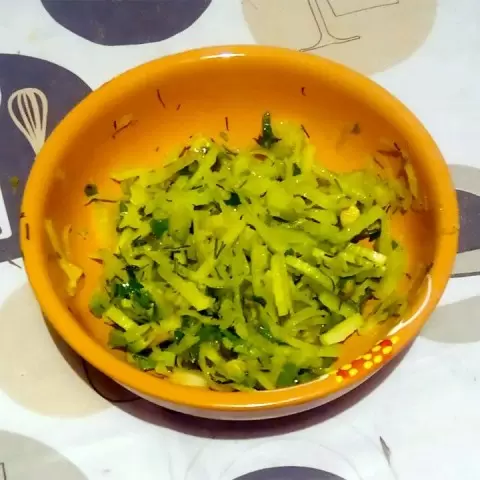 Этот салат готовится всего за пять минут! Для начала стебли сельдерея и мякоть авокадо необходимо нарезать небольшими тонкими ломтиками. Дайкон или редис лучше натереть на крупной тёрке. Все ингредиенты следует тщательно перемешать, добавив мелко нарезанную зелень. В качестве финишного штриха заправьте получившуюся смесь растительным маслом и, при желании, добавьте экстракт базилика для усиления аромата.