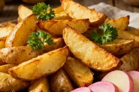 Этот простой, но невероятно вкусный способ приготовить картошку понравится всем! Крупные клубни нарезаются дольками, присыпаются ароматной смесью из чеснока и паприки, затем запекаются до золотистой корочки. Подается с чесночным соусом или свежими овощами, это блюдо отлично подходит как для повседневного стола, так и для праздников.