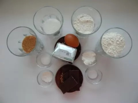 Сначала следует подготовить тесто. Для этого в глубокой миске смешиваются все сухие ингредиенты: мука, соль, разрыхлитель и крахмал. Если вместо шоколадной крошки используется плитка, ее необходимо мелко нарезать. Орехи также можно слегка измельчить.