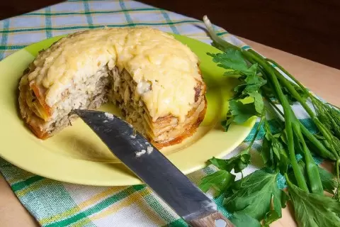Блинный торт с грибами и сыром в трубочках