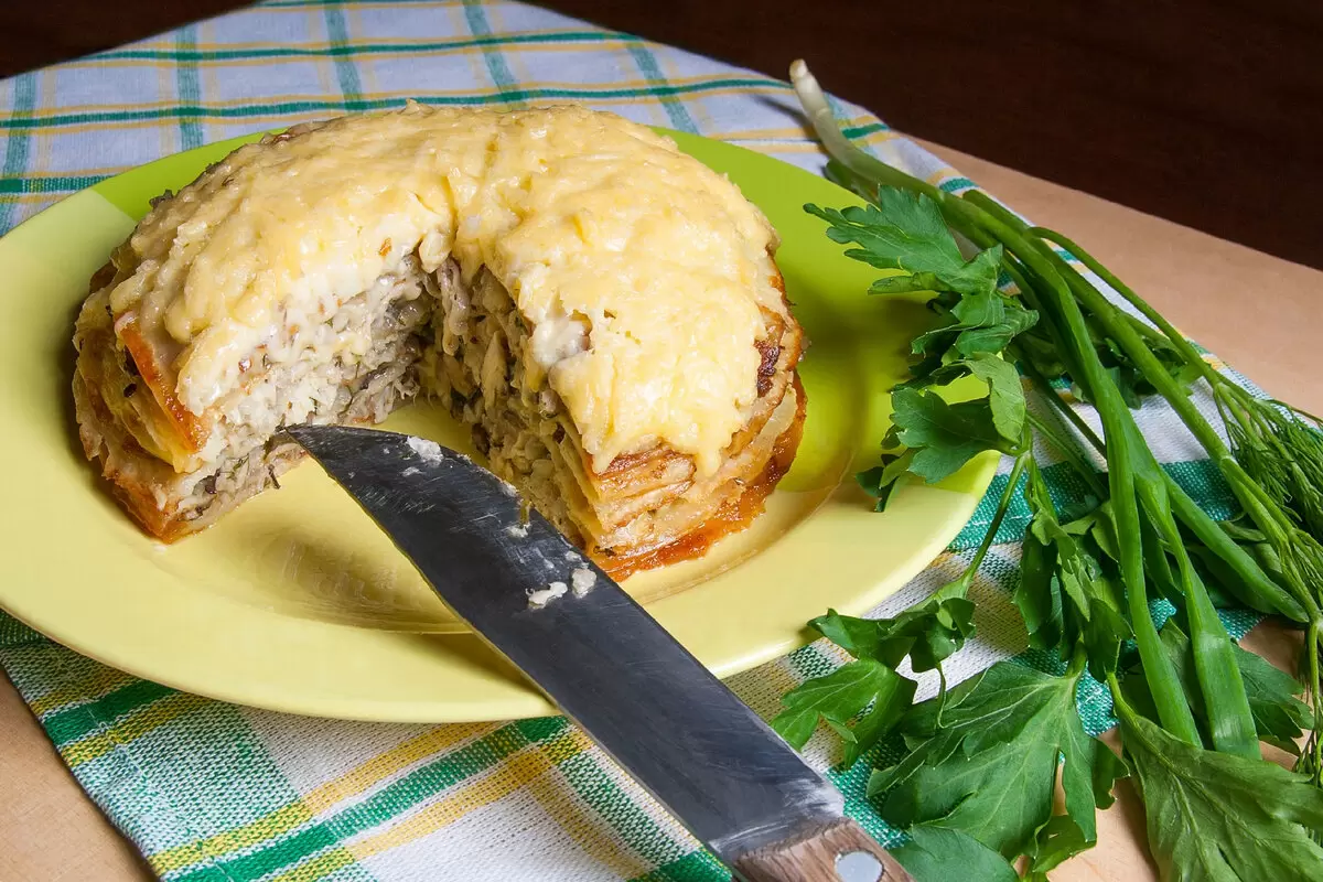 - На блин укладывать слой грибной смеси и тертого сыра, чередуя их.