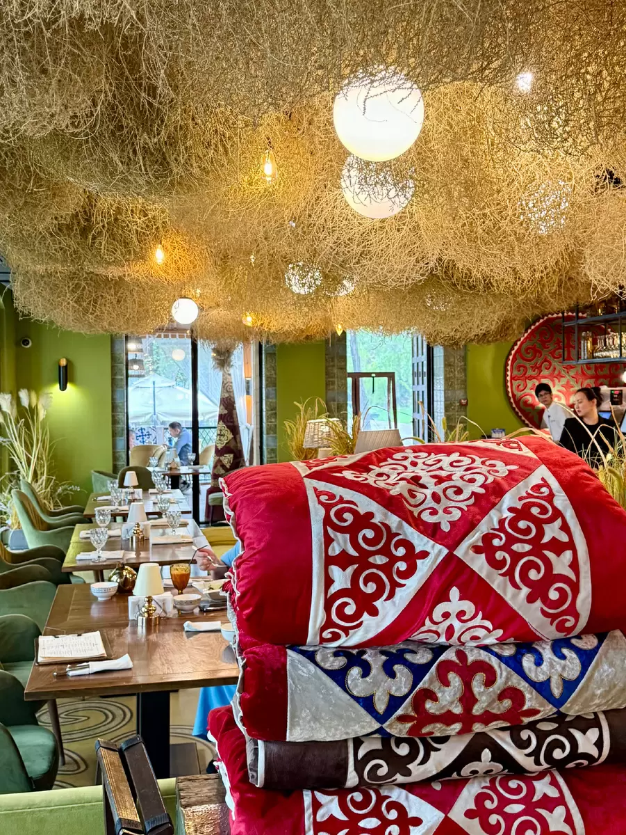 Ресторан представлен в виде казахского аула с искусственными лошадями и юртами, создающими ощущение живописного уюта. Просторные беседки на зеленом травяном покрове идеально подходят для дружеских встреч и праздничных застолий. Главное здание оформлено в традиционном стиле, с множеством столов и баром, обставленным национальными тканями и костюмами, что никого не оставляет равнодушным.