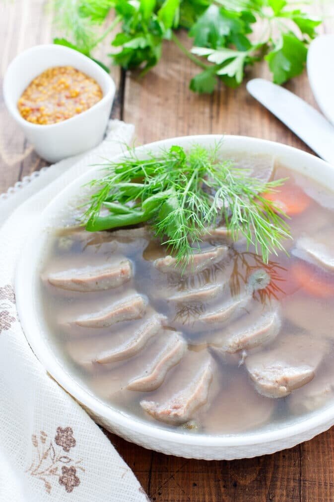 Бульон следует процедить через мелкое сито, а язык нарезать тонкими слайсами. На красивом блюдце раскладываются кусочки языка, которые можно украсить нарезанной морковью и зеленью по вкусу. Аккуратно заливается бульон с желатином, и далее блюдо отправляется в холодильник на 6 часов, но лучше всего оставить на ночь для полного застывания.